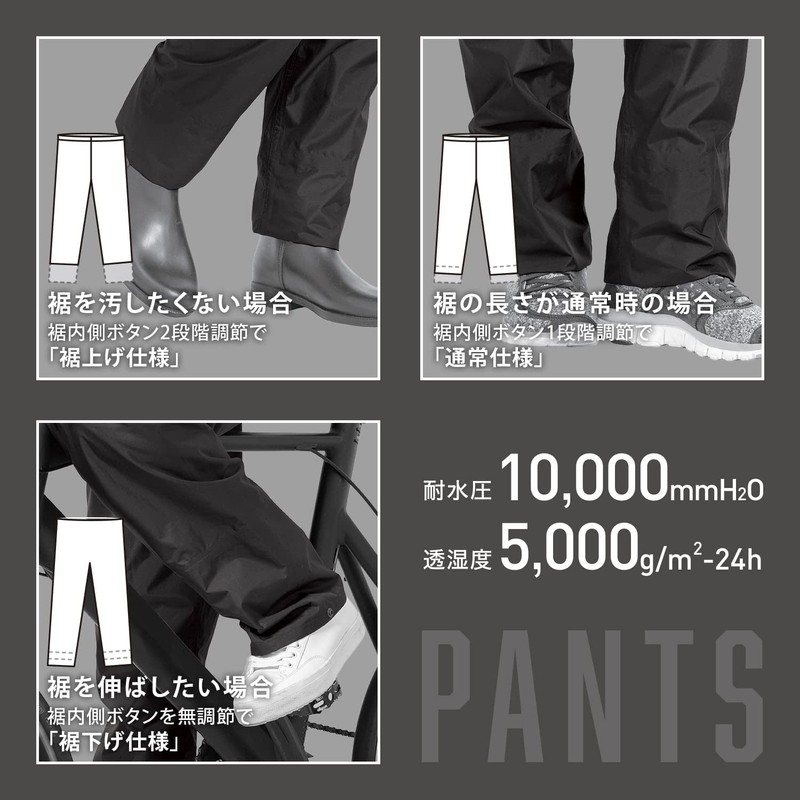 • Hem-Up Rainwear: Unlike traditional rainwear that only allows for shortening the pants' length, this adjustable rainwear can be both lengthened and shortened.If you fasten one button on the inside hem, the pants become standard length. Fastening two buttons lifts the hem, preventing your pants from getting dirty.If you unfasten the button, it lets the hem down, allowing you to adjust based on the occasion or purpose.You can adjust the pants length by ± 2 inches (±5 cm)