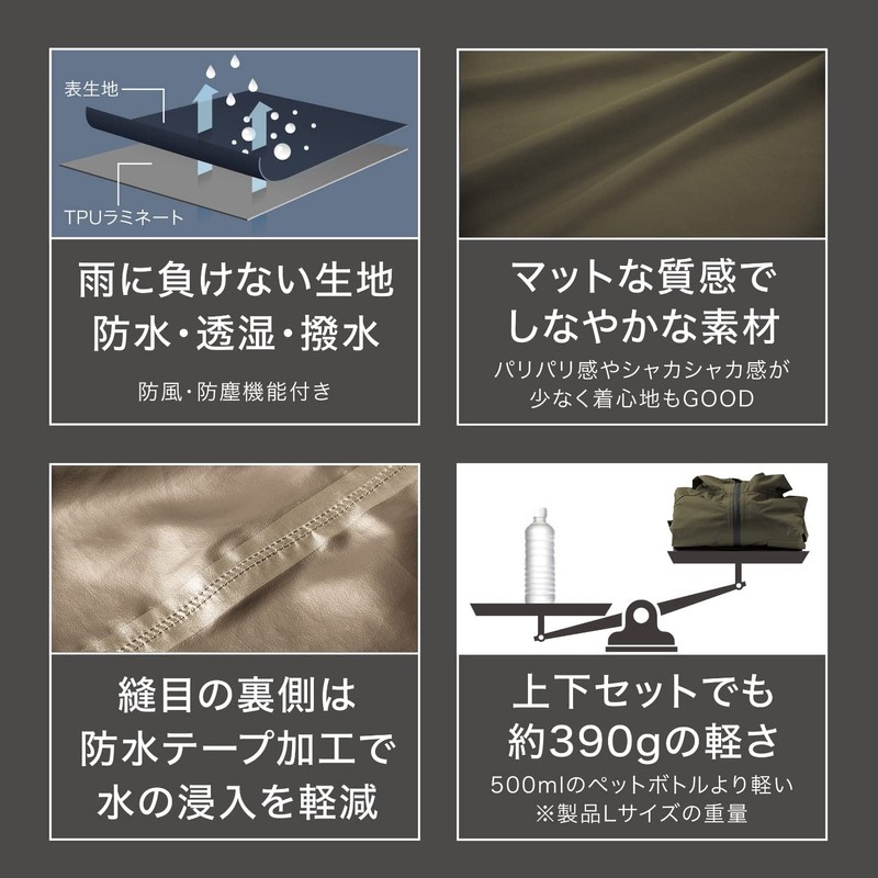 • Lightweight, Waterproof, Reduced Stuffiness: The adoption of TPU laminate material provides ease of movement and comfortable wear.The combined weight of the top and bottom set is approximately 13.7 oz (390 g) for size L, which is lighter than a 16.9 fl oz (500 ml) plastic bottle, making it convenient to carry.The fabric is not only waterproof and water-repellent but also breathable, making it unbeatable in the rain. It has a matte texture and is flexible, ensuring outstanding comfort without the nuisance of rustling or swishing sounds.The seams' underside is sealed with waterproof tape to minimize water infiltration.For enhanced visibility, the jacket's back has a wide retroreflective strip.Plus, it's well-ventilated to reduce stuffiness, ensuring comfort even on rainy days
