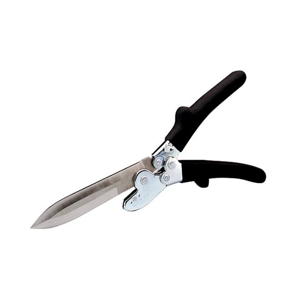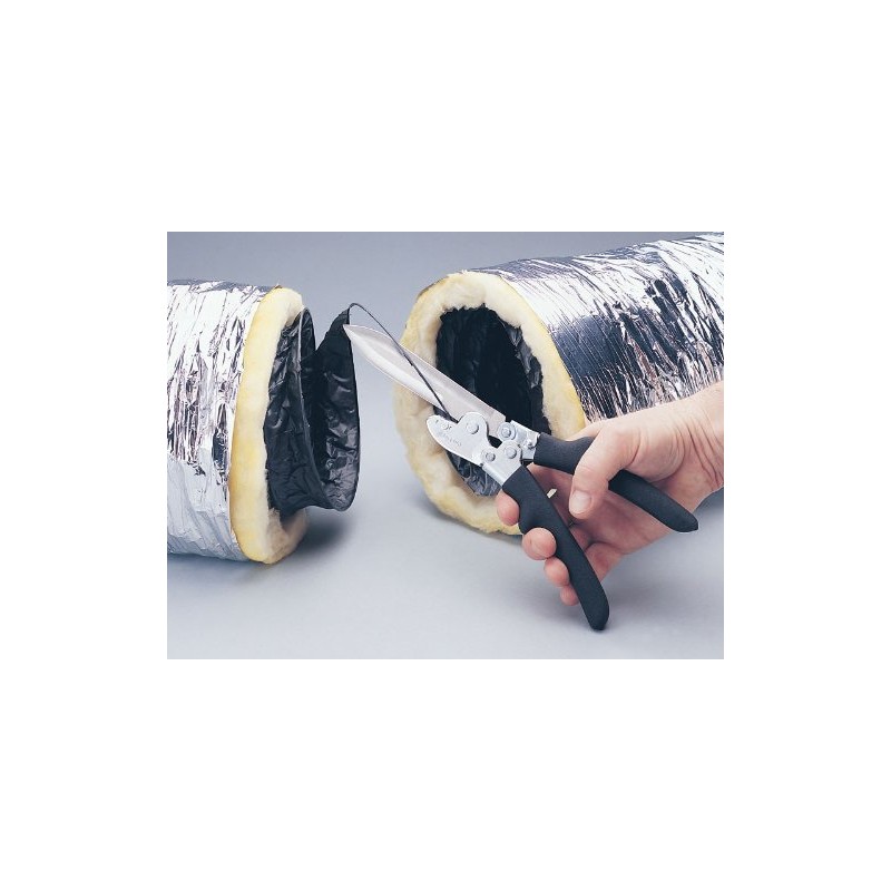 Flexible Duct Cutter, Cutting Length 6 In., Overall Length 11-7/8 In., Handle Design Compound Leverage w/, Handle Color Black, Material Stainless Steel Blade, Steel Handle Stampings, Features Compound Leverage, Double-Edge Pointed Bottom Blade Pierces Wall Of Flexible Round Fiberglass Wool Dust, Cuts In Either Direction, Wire Cutter Cuts Liners Hardened Wire Rib Coil