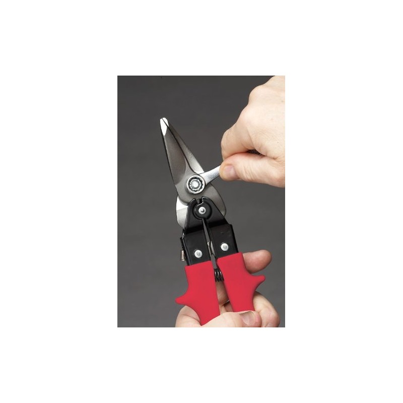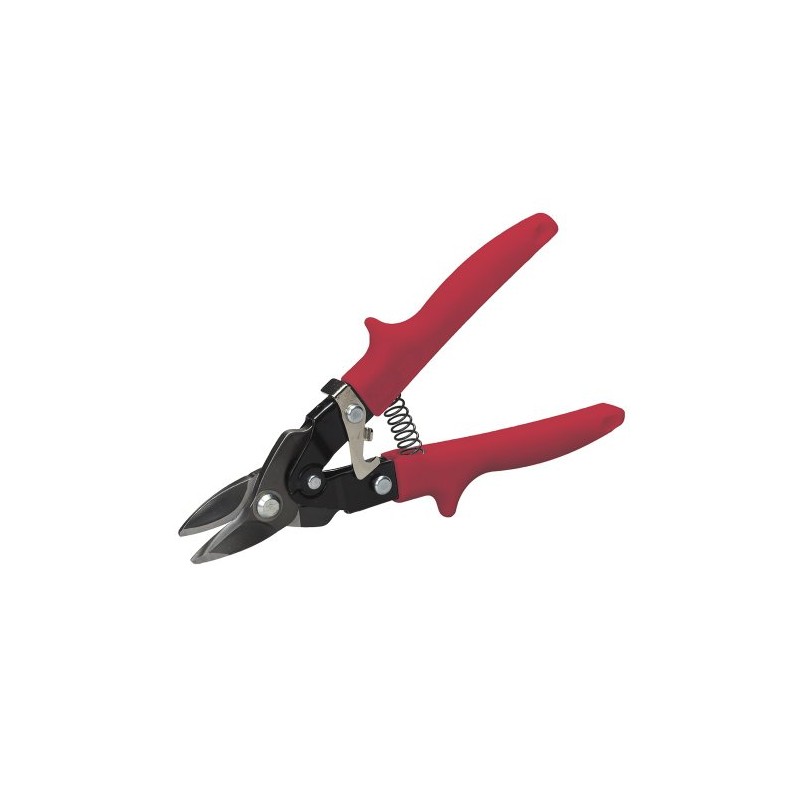 Bulldog Aviation style metal snip (red grip) for cutting and notching heavier material. Hardened alloy steel blades offer maximum cutting life. Superior material flow allows maximum maneuverability. Ergonomic handles maximize length of cut and hand's natural power stroke.