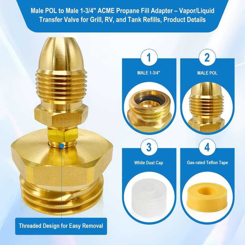 - Propane Fittings & Adapters Kit includes: 1 fill filler coupling adapter set (Male POL to Male 1-3/4" ACME Thread Vapor Liquid Transfer Valve Adapter), 1 roll of gas-rated Teflon tape, plus fast, reliable 24/7 customer support whenever you need it.