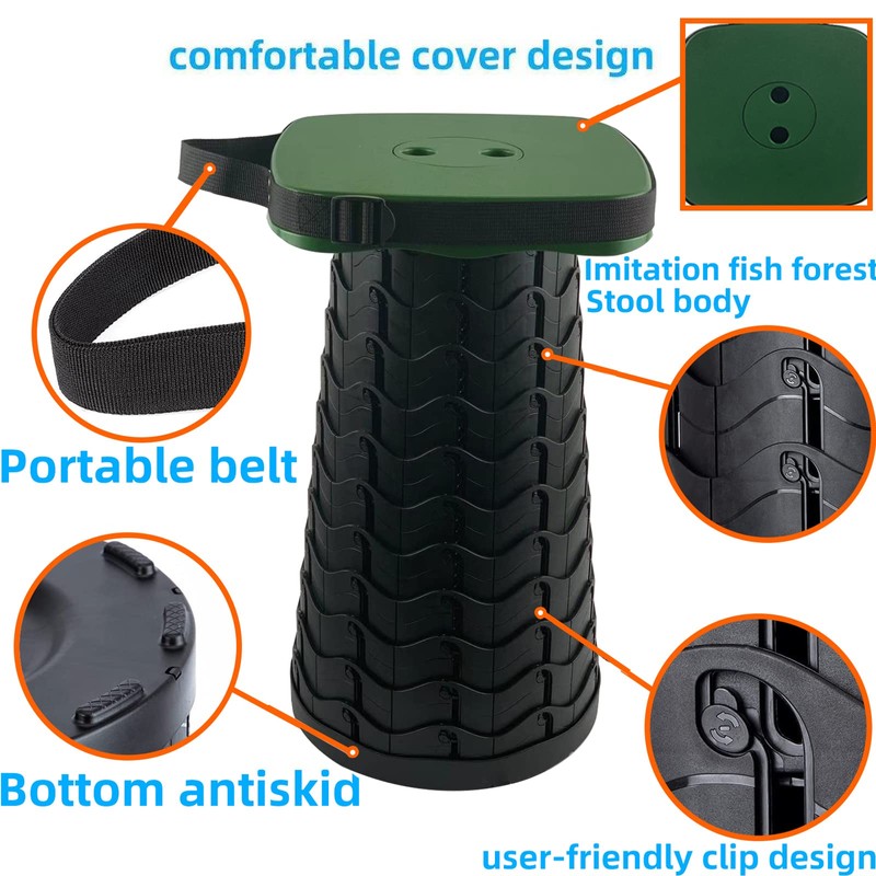 - đăSAFE & STEADYă- Our retractable stool is made of high strength eco-friendly engineering plastics material, the retractable folding stool has a strong bearing capacity and it can hold up to 485lbs in dynamic and 579lbs in static, which will meet your needs effortless. The folding stool has 120 tight connecting clasps and non-slip bottom, so you can sit it on safely. the perfect and smooth curve can be seen directly, the unique smooth feeling of opening and closing, and the perfect combination of firm locking way.