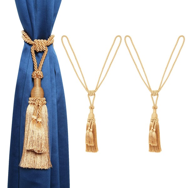 MALOINTEX 2 Pack Curtain Dual Tassel Tiebacks Tie-Backs, Handmade Rope Tiebacks Holdbacks, Polyester Curtain Tieback - Gold