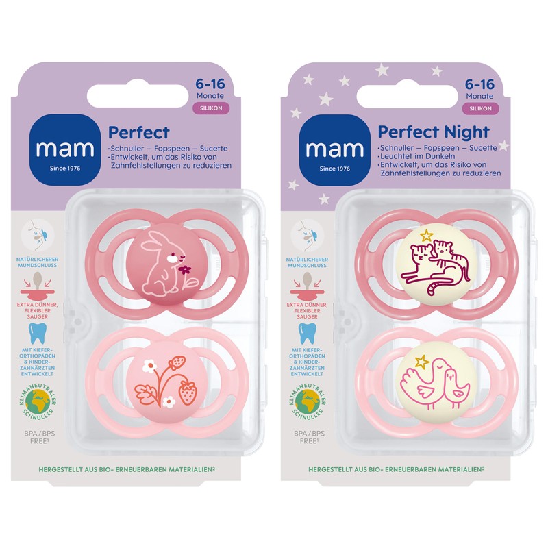 - Prevents tooth misalignment - The climate-neutral MAM Perfect Set has been developed with experts and significantly reduces the risk of tooth misalignment. The button glows in the dark, so the dummy can be easily found again