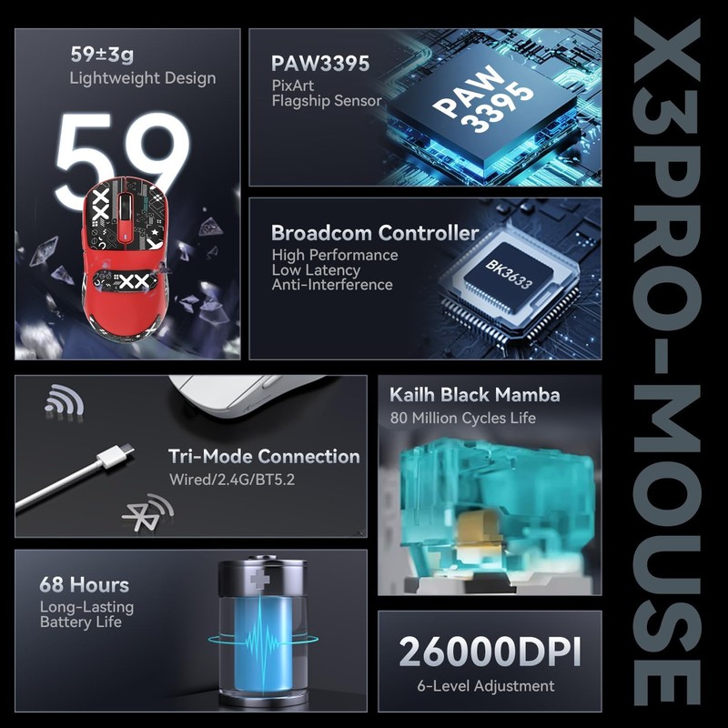 - 【Ultra-Lightweight 49g Design for Enhanced Speed】Dominate the competition with the X3 Mouse, weighing in at an incredible 49g. Its featherweight, ergonomic design is 30% lighter than the G Pro X, ensuring rapid movements and pinpoint accuracy in intense gaming sessions. Whether you're battling in a fast-paced FPS, navigating through an MMO, or strategizing in a MOBA, this mouse is designed for peak performance.