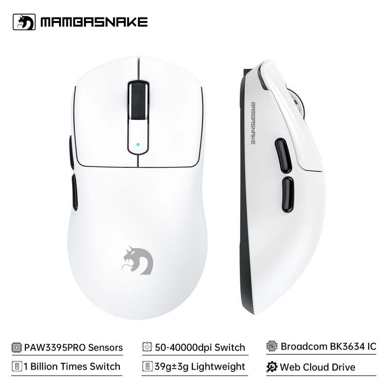 MAMBASNAKE × Attack Shark M3 Wireless Gaming Mouse, 39g Ultra-Lightweight BT/2.4Ghz/Wired Computer Mouse, PAW3395PRO 40K DPI Optical Sensor, Programmable Mice for PC/Win/Mac(White)