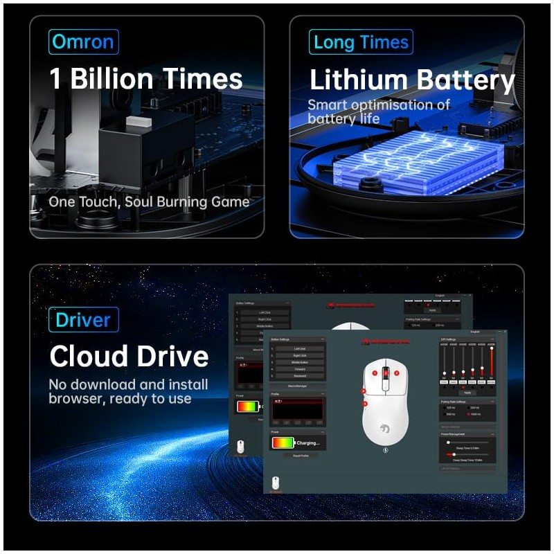 • Tri-Mode Wireless Freedom: Tri-mode connectivity (2.4GHz/Bluetooth/USB-C) adapts to gaming, office, and creative workflows. The 2.4GHz band employs military-grade encryption for 300% stronger anti-interference, paired with Omron switches rated for 100 million clicks. USB-C PD charging delivers 8-hour battery life with just 1-minute charge.