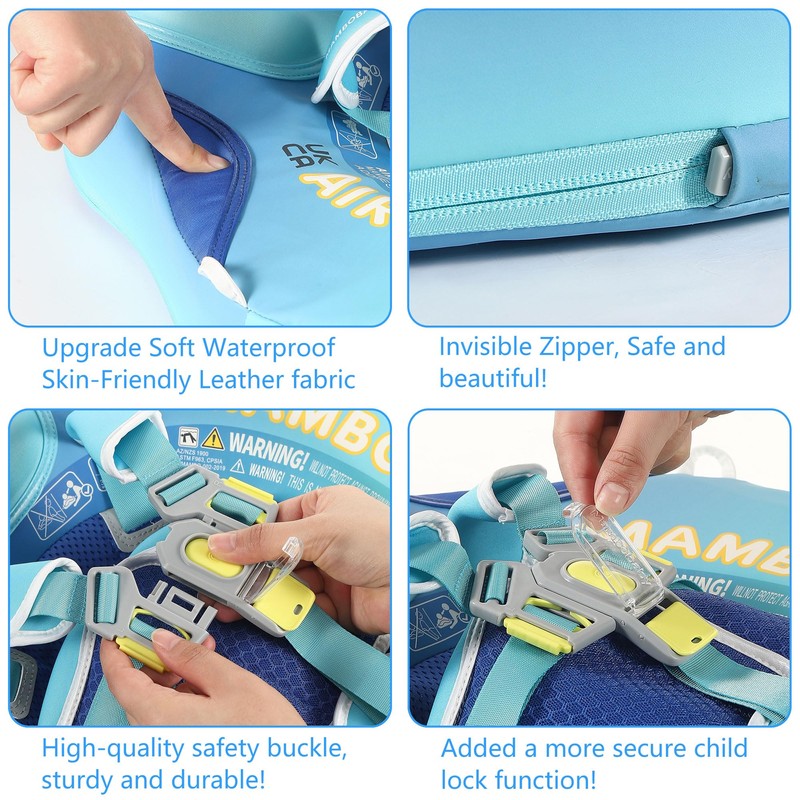 - 【360° FULL PROTECTION】Add removable tail, Prevent baby from flipping backward. Upgraded safety buckle, The Upgraded safety buckle provides 5 support points and perfect 40°angle to keep a balance to avoid baby flip over and fall off. Upgraded into 2 swim ways which are backstroke and breaststroke with different buckle method. Backstroke Suitable for 3~6months baby, breaststroke Suitable for 3~24months baby.