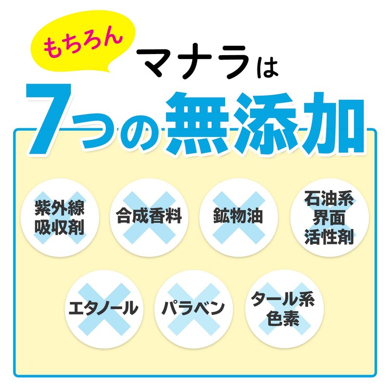 - At Manara, we aim to create a product that is gentle on the skin with 7 additives. UV Absorber x Synthetic Fragrance x Mineral Oil x Petroleum Surfactant x Ethanol x Parapen x Tar Dye