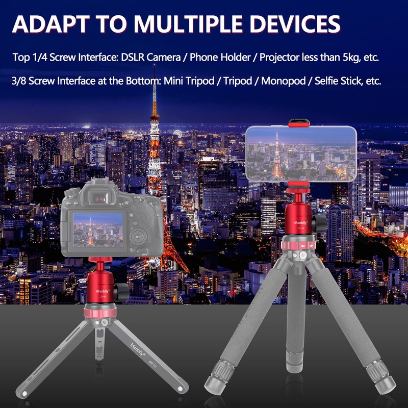 - [Hochstabiler Metallkugelkopf] : Dieser Manbily Kugelkopf besteht aus einer hochwertigen Aluminiumlegierung mit einer soliden Konstruktion und einem glatten eloxierten Aussehen, das sicher und leicht ist. Die 28mm Kugel des CNC-Prozesses bietet stabile Unterstützung.