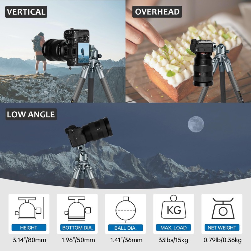 - [Portable Tripod Head] : The Q-36 ball head is equipped with a larger 36mm diameter ball, the MAX load is up to 15kg, and Weighing only 360g. Compact, lightweight construction makes it easy to carry anywhere, ensuring effortless setup for travel, outdoor, shooting and on-the-go photography.
