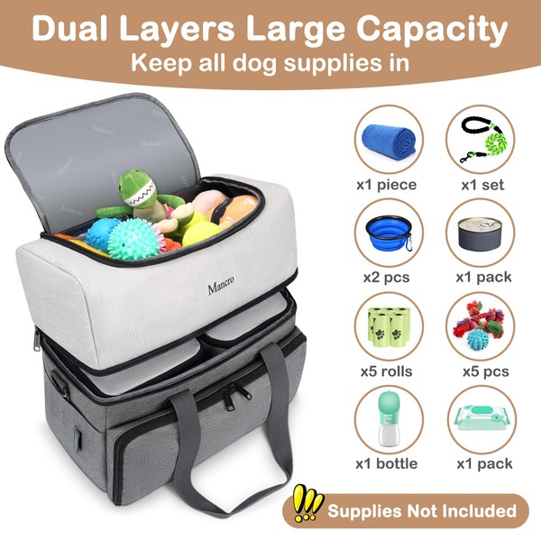 Mancro Mancro Dual Layers Dog Travel Bag, Pet Travel Bags with 2 Extra Large Food Containers, 2 Collapsible Dog Bowls, Multi-Pockets Tote Organizer for Dog Supplies, Dog Road Trip Essentials, Weekend Camping