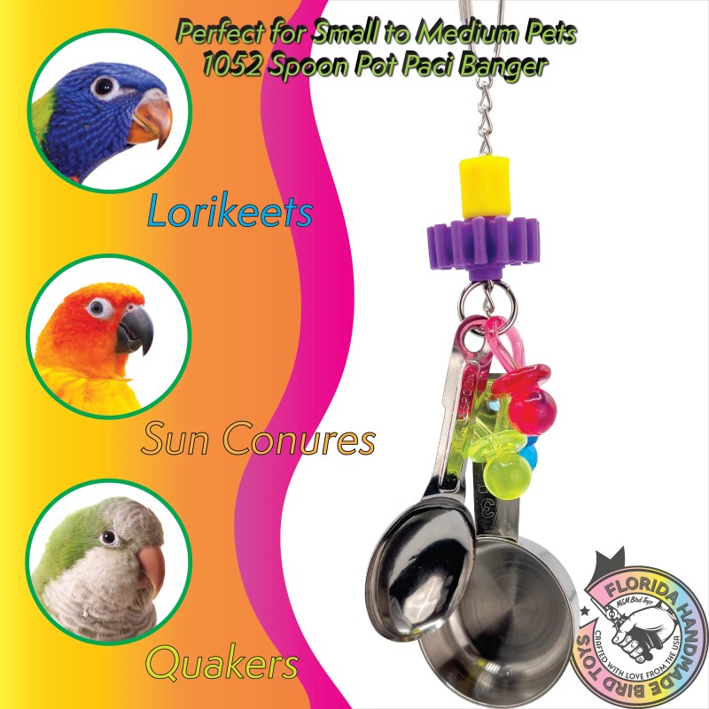 The 1052 Spoon Pot Paci Banger form M&M Bird Toys is a super noisy, colorful and alluring toy. This bird toy has brightly colored translucent acrylic pacifiers and stainless steel parts.