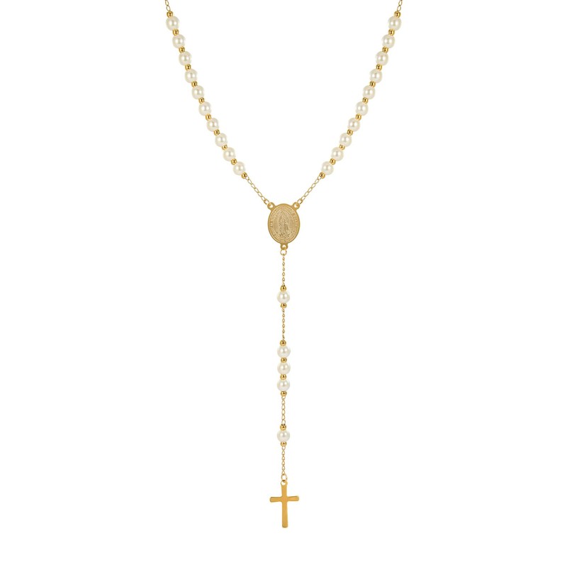 - Classy Rosary Inspired Necklace, Features a crucifix cross pendant and miraculous center medallion in the middle and holy soil. Unique stainless steel bead rosary chain design.