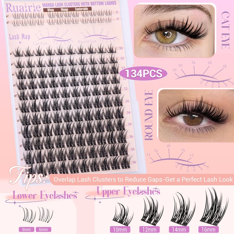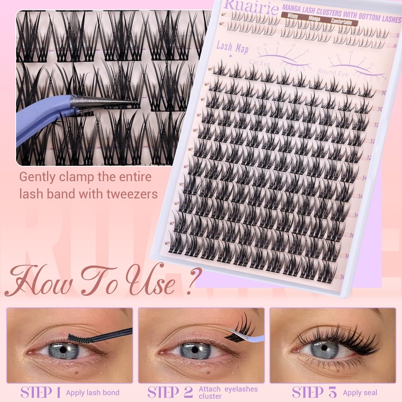 - 4.10-16mm DIY Clusters Eyelashes: Ruairie lash extensions are available in lengths from 10-16mm, allowing you to create lash clusters looks according to your eye shape and makeup. Whether it's a cat eye or a round eye, these eyelashes clusters can easily achieve the desired effect.