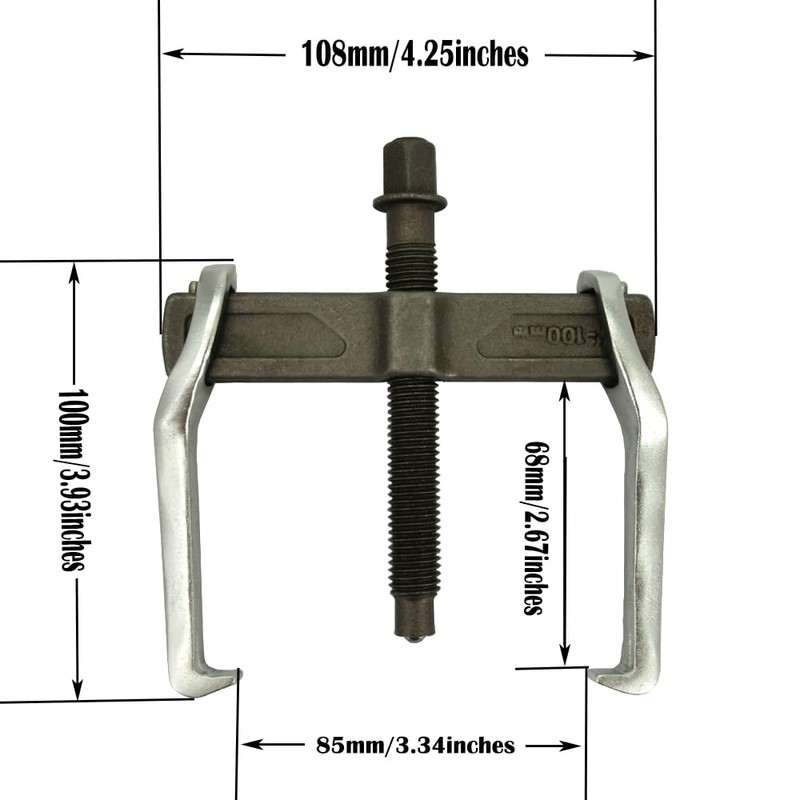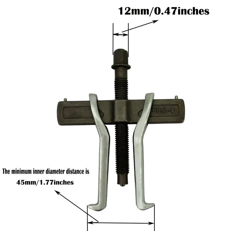 - Mark 4"-100mm size - The screw length of the two jaws puller is 4.52inches/115mm,Bracket Length:4 inches/ 100mm(Due to the anti-falling pin, the actual bracket is only 90mm/3.54 inches for use ),Screw Diameter (top): 12mm,Screw Diameter (bottom): 10mm,Claw Length:4inches/100mm(The actual length of the claw installed on the bracket: 67mm /2.63"), For more size description please see size picture.