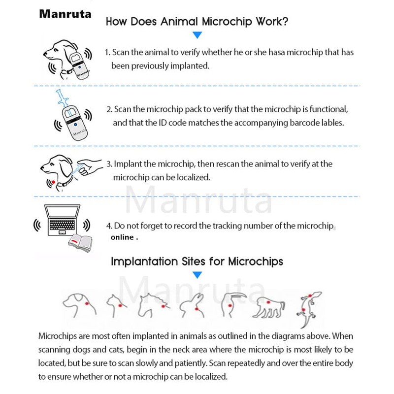 - {MANAGE YOUR PETS} : Keep your pets safe with Manruta Microchips. Our RFID microchip implant Kit gives your pet chance to return home if ever lost or stolen.