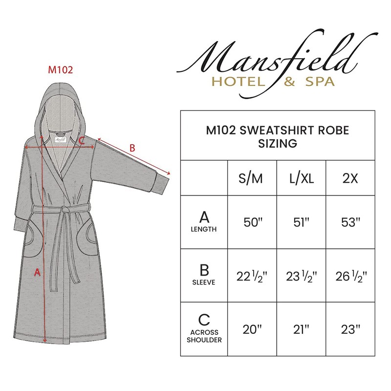 This full length, hooded, unisex robe is made with the fabric of your favorite sweatshirt. Since it's a robe from Mansfield Hotel & Spa, it's cozy and comfortable. The 80% - 20%, cotton-nylon blend makes for a robe that is very comfortable and durable. Contemporary stitching on the pocket and sleeves, this robe will definitely add a contemporary flare to your assortment. Enjoyed by both men and women everywhere, from hot springs to ice baths to relaxing right at home, this versatile, deluxe bath robe personifies the blissful spa lifestyle.