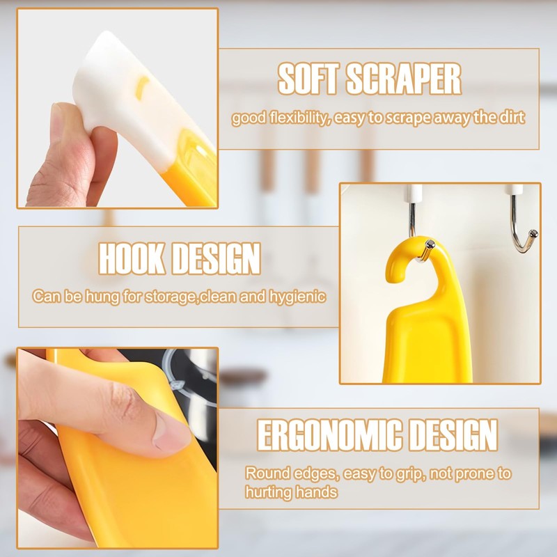 - 3.Easy to use:The soft plastic pan scraper edge can seamlessly fit to many kinds of surface or inner wall of cookwares, easy to remove leftovers, The dish cleaning spatula is made of very durable and lightweight silicone, which is light, strong, and flexible.