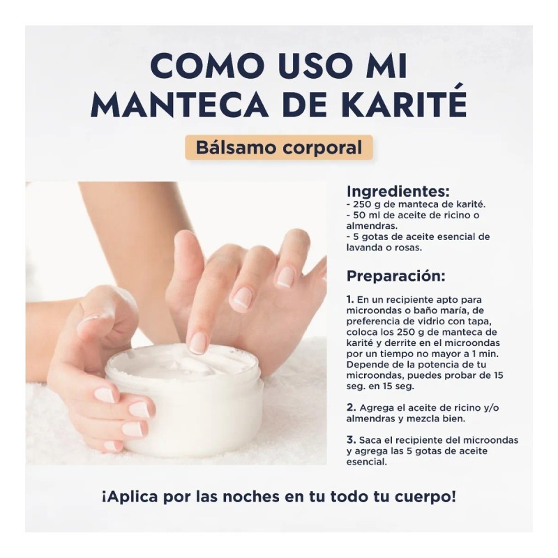 -Mascarilla Capilar Reparadora: ¿Cabello dañado, sin brillo o con problemas de cuero cabelludo? Derrite una cucharada sopera de Manteca de Karité (evitando el cuero cabelludo si es graso), aplícala de medios a puntas, déjala actuar por 30 minutos y enjuaga. Notarás un cabello más hidratado, brillante y con volumen.