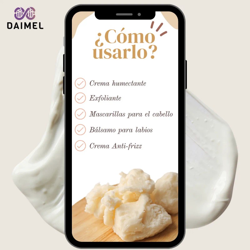 💚 La Manteca de Karité Orgánica 100% pura (2 kg) es un tesoro natural para el cuidado intensivo de la piel y el cabello. Rica en vitaminas A, E y F, esta manteca sin refinar ofrece una hidratación profunda, acción regeneradora y protección antioxidante, ideal para piel seca, agrietada, cabello dañado o puntas abiertas.