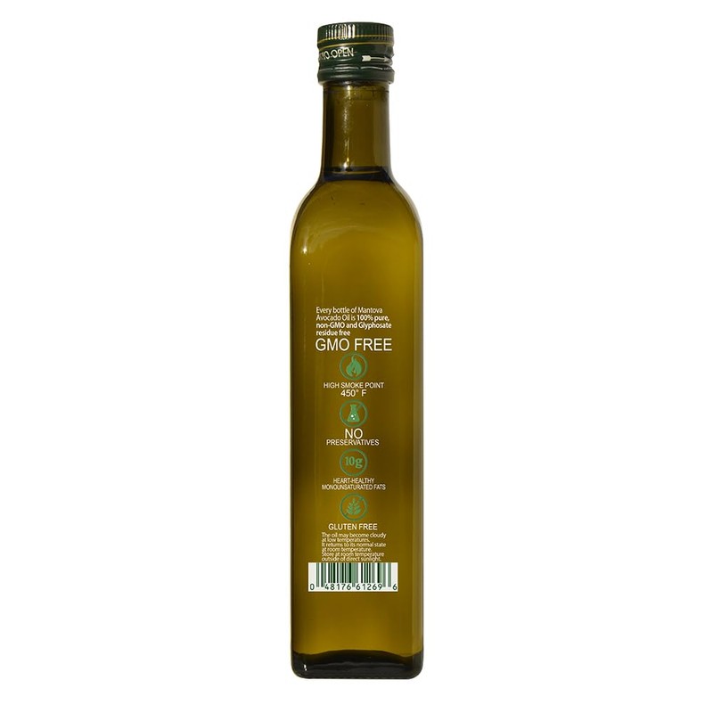 - Mantova Avocado Oil is 100% PURE, all-natural and handcrafted from premium avocados, this Emerald green oil is wonderful in salad dressings, on fresh-cut fruit or grilled fish.