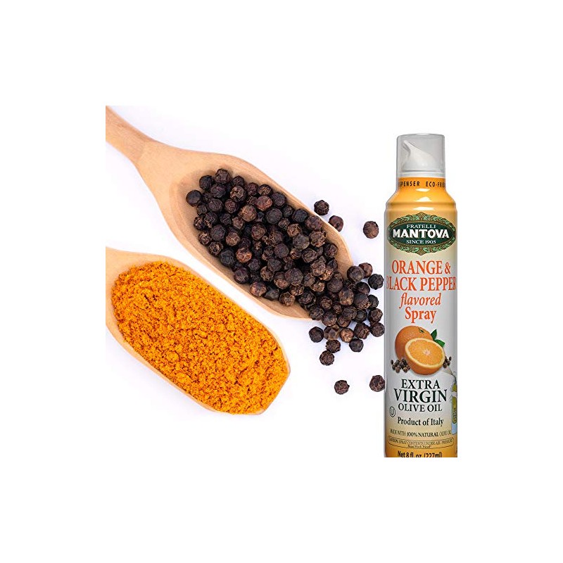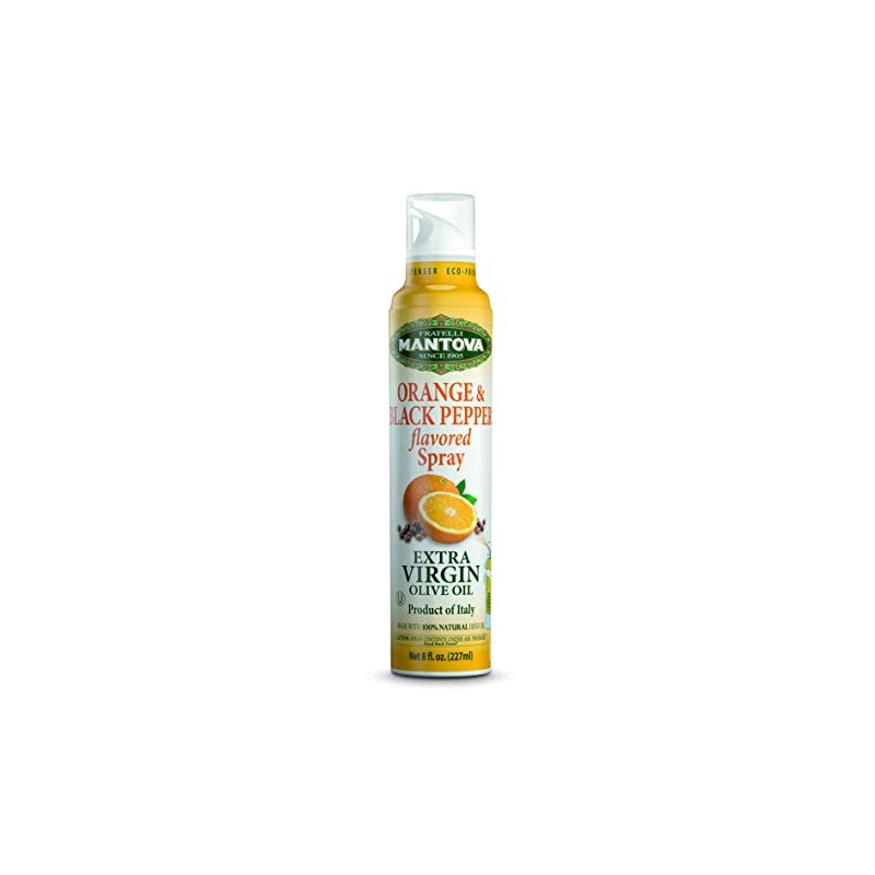 - Made in Italy, our Mantova Orange & Black Pepper Flavored Extra Virgin Olive Oil Spray bottle preserves all the genuine qualities of 100% natural Italian EVOO in an olive oil dispenser that lets you spray just the right amount for your dish.