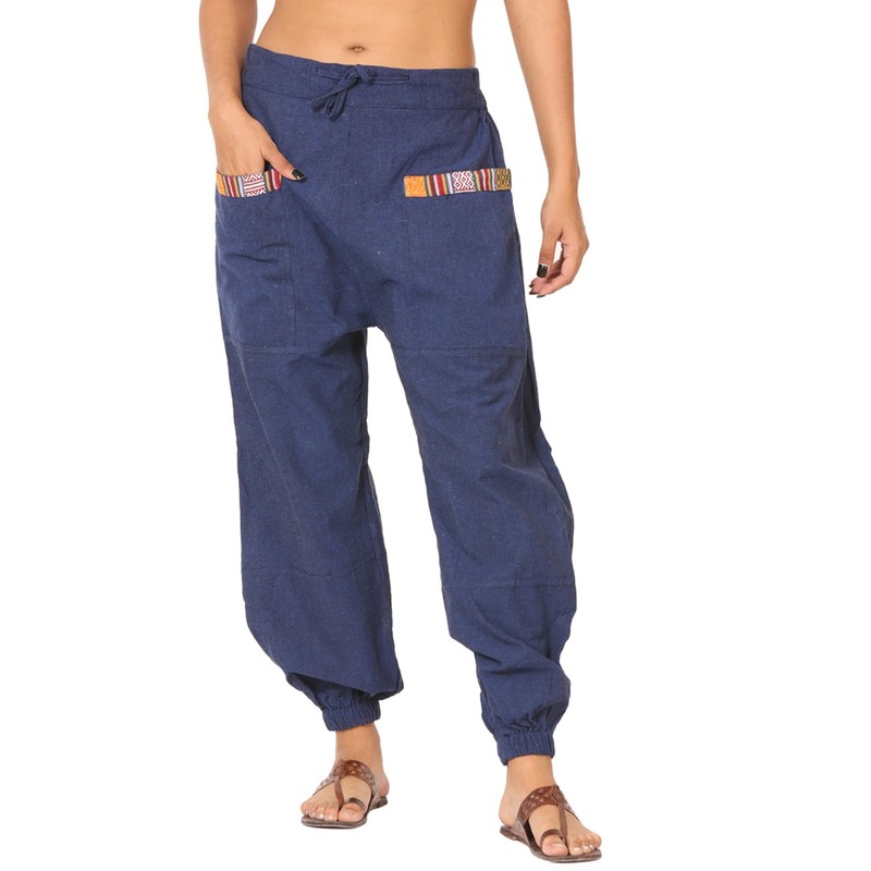 Mantra Vogue Boho Style Cotton Yoga Workout Harem Pants with Elastic Drawstring Waist and Front Pockets for Women (CA/US, Alpha, One Size, Regular, Regular, Dark Blue)