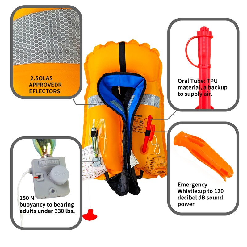 - Inflatable life jackets can be reused after each inflation. Please always read your user manual to learn how to correctly inflate the life jacket for the first time and how to re inflate it after inflation. (Inflatable accessory specification: 33 gco2 gas cylinder, 1/2 inch thread)