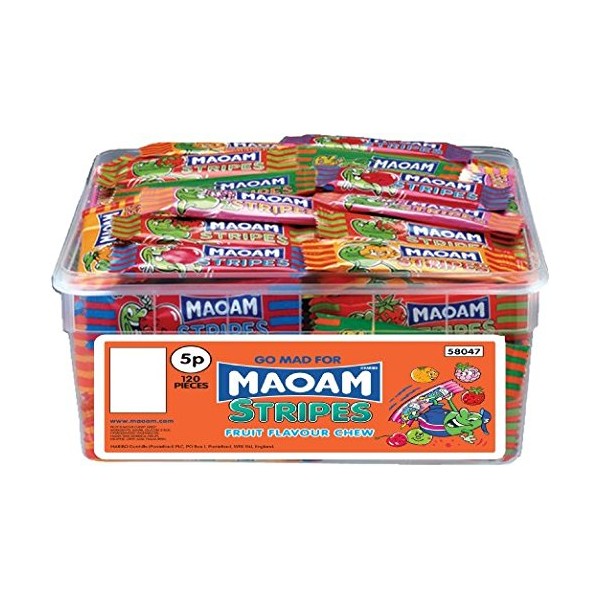 Yummy Maoam Stripes chewy sweets from quality confectioners Haribo, great for party bags, sharing with friends or keep them all to yourself. These small, flat, fruit flavoured chews are an irresistable treat all the family will love. The 10cm x 20cm x 20cmfull tub holds 120 individually wrapped pieces and has a lid for convenient storage. Ingredients: Sugar, glucose syrup, hydrogenated vegetable oil, humectant (sorbitol syrup), gelatine, citric acid, flavouring.