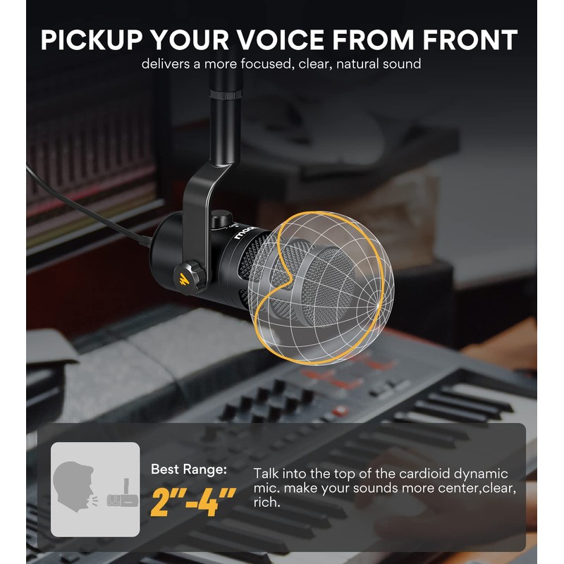 • Effectively Reduce Noise: PD100U USB microphone built -in woven nets and anti -spray sponges, 1 +1 double -layer physical noise reduction to ensure sound permeability, effectively reduce the impact of airflow when recording, the cardioid dynamic microphone accurately pick up from the top of the microphone, inhibit the sounds from sides and back well, make your voice more concentrated, clear, charming. (best pick up range: 2"-4")