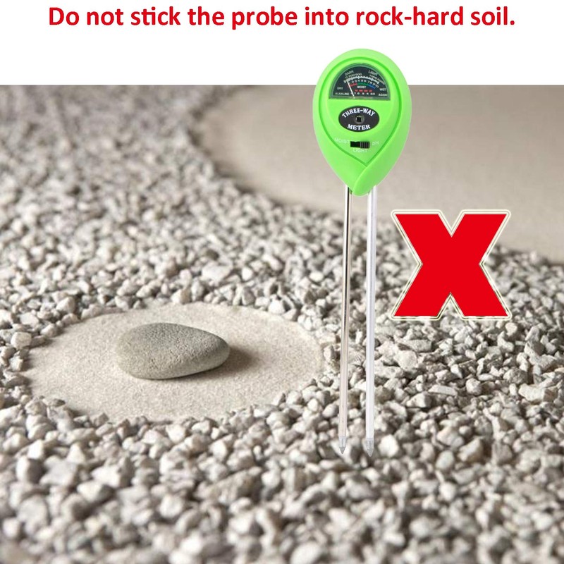 - 🍀 ◀Important Warm Tips▶Please do not touch the stone or hard rock soil, it is easy to damage the probes if the soil is too hard and dry. Do not use the soil tester kit to test pure water or other liquid, electrolytic response index will be affected, the sunlight calculator can only be used to measure the soil. After use, please wipe clean the probe.