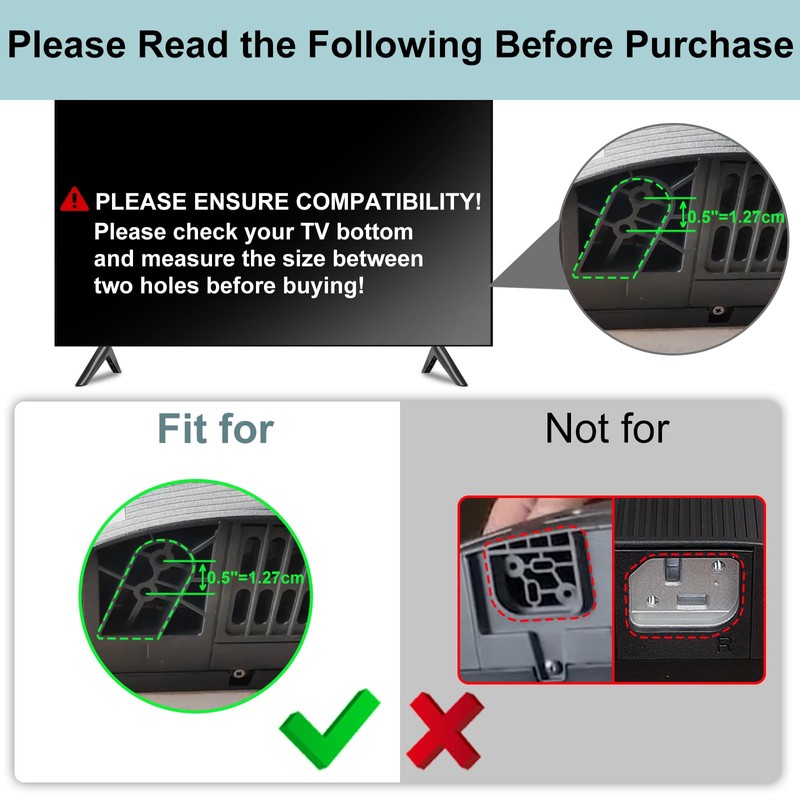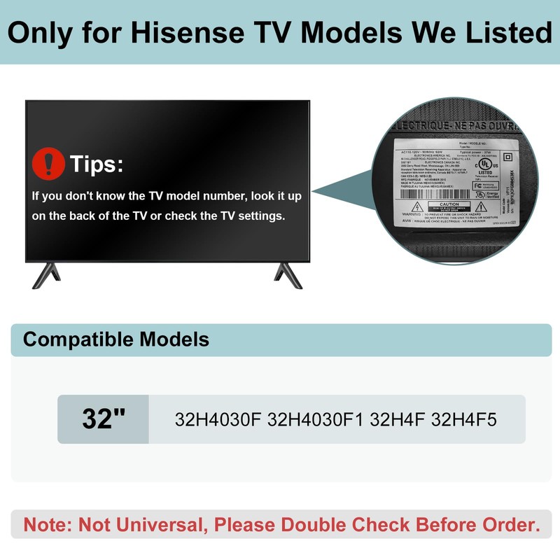 - ⚠ Important Notes: Only for the Hisense TV models we listed! Not universal stand legs! Please check the bottom mounting hole of your TV before purchasing and carefully check our second image.