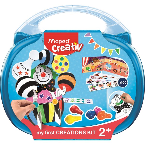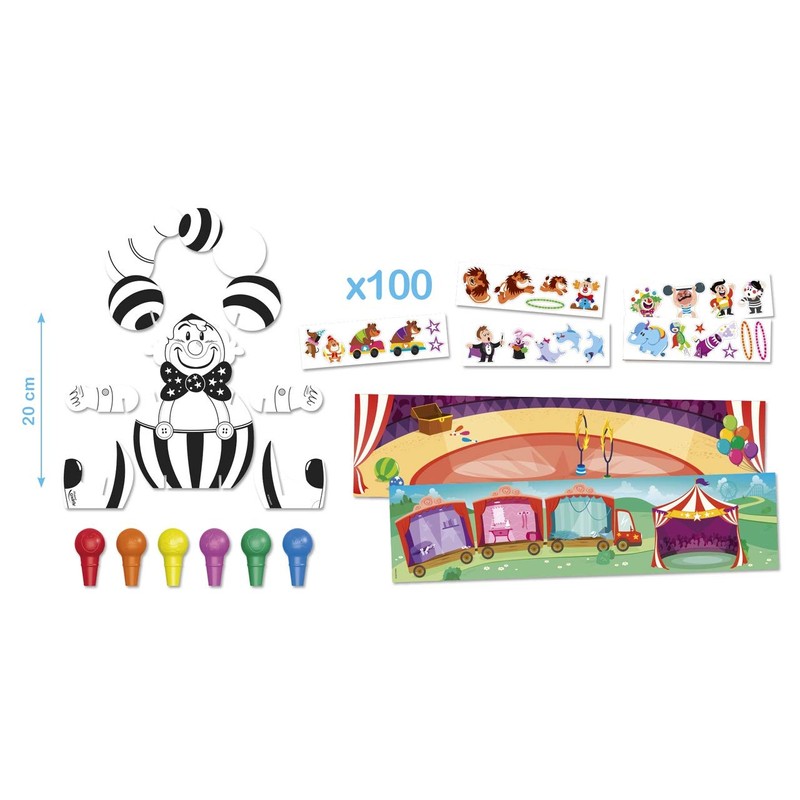 - - Put your circus together - Products specially developed for children's hands 1. Colour out the clown and stick stickers on it. 2. Build the clown with the help of your parents 3. Stick on the circus picture with stickers - Recommended age: from 2 years - Contents: - 6x baby wax crayons COLOR'PEPS painting drops - 1x clown for painting, sticking and sticking together - 1x circus picture to stand up - 100x stickers especially for toddlers - 1x reusable plastic case - ideal for on the go