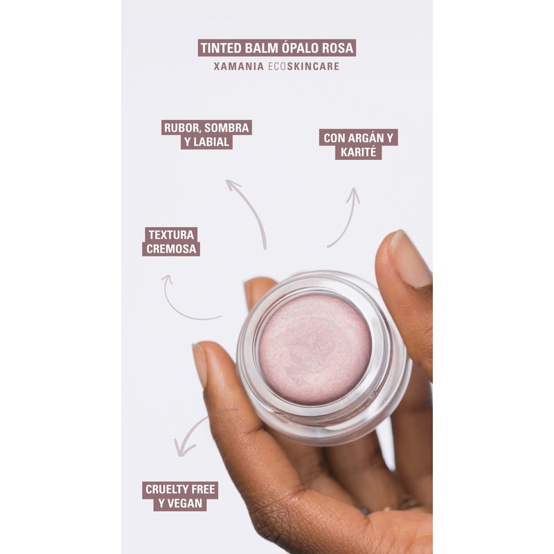 Los Tinted balms de Xamania formulados con ingredientes 100% naturales como el aceite de argán y karité, son en crema y se pueden usar como rubor, bálsamo labial, sombra y contour. Su uso es 4x1 : 4 usos en 1 producto fácil de llevar en la bolsa y con un acabado delicado y 100% natural.