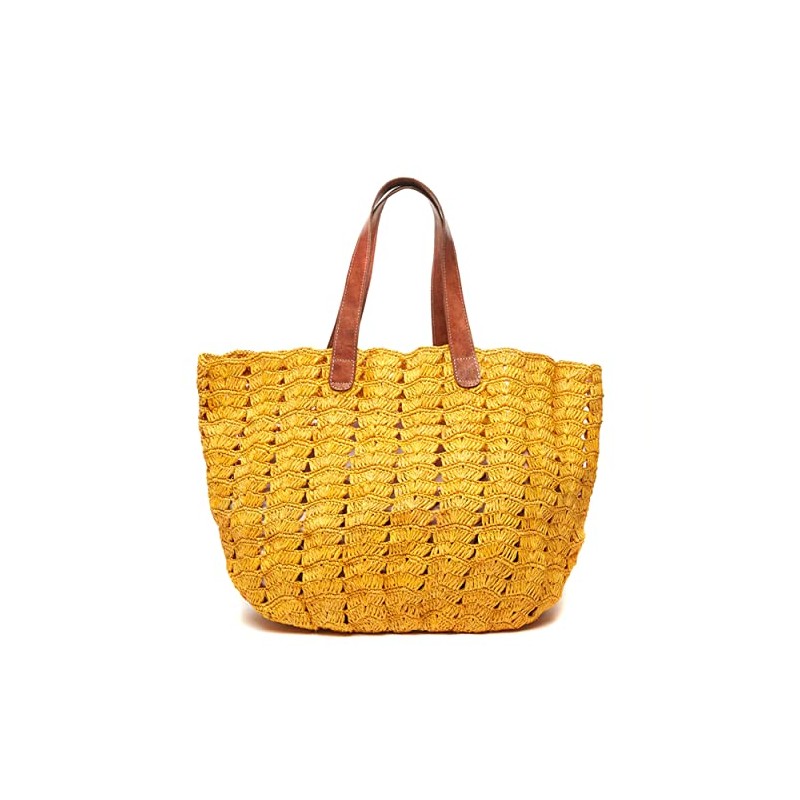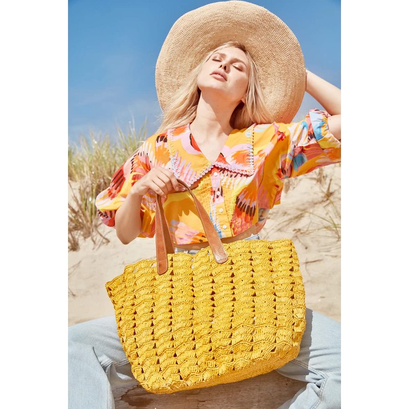 MAR Y SOL Paros Scalloped Open Crocheted Raffia Carryall Tote Beach Bag (Sunflower Yellow)