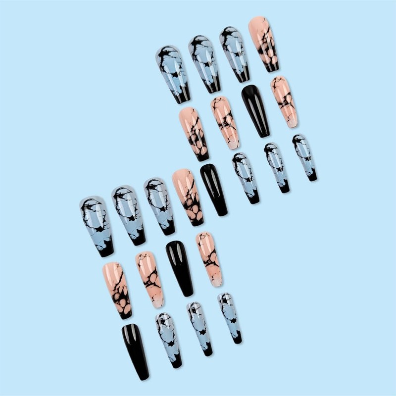 Marble Press on Nails Long Coffin Fake Nails with Design Ombre Black Glue on Nails Gradient Blue False Nails Glossy Reusable Spring Nails for Women Girls Manicure 24pcs