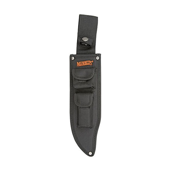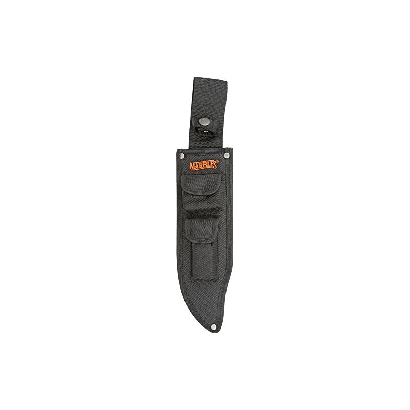 Black nylon construction with orange embroidered Marbles logo. Made to fit Marbles Jungle Bowie or other similar fixed blade knife with up to 10" blade. Cargo pouch and pouch with sharpening stone. Bulk packed.