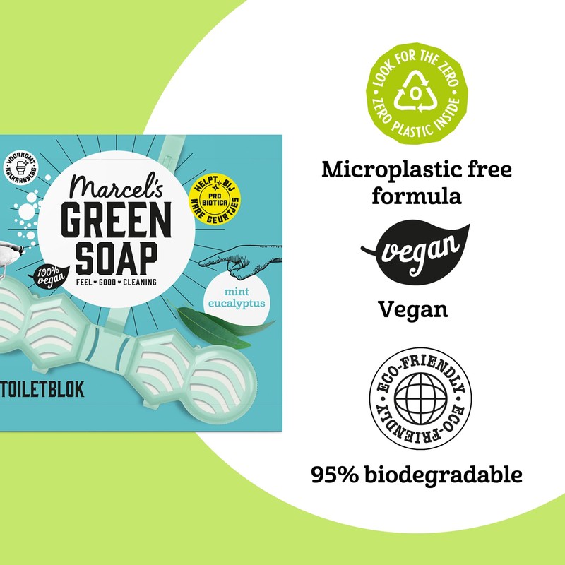 - Marcel's Green Soap Mint & Eucalyptus Toilet Rim Block contains 99% natural ingredients and prevents unpleasant odours due to its probiotic contents.