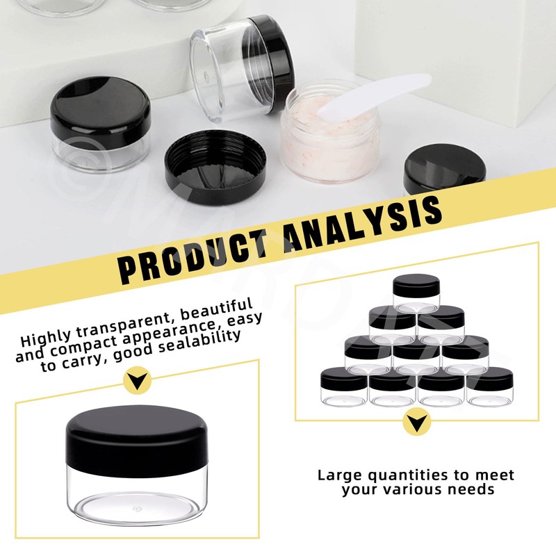 • ☞【Wide Application】The plastic empty storage jars are designed for storing makeup, toners, creams, manicure, eye shadows, lotions, essential oils, candles, pigment, body butter, face creams, bath salts, various sample and so on. Suitable for holding nail designs, beads, small jewelry, powder, or used in kitchen storage for dry goods or spices.