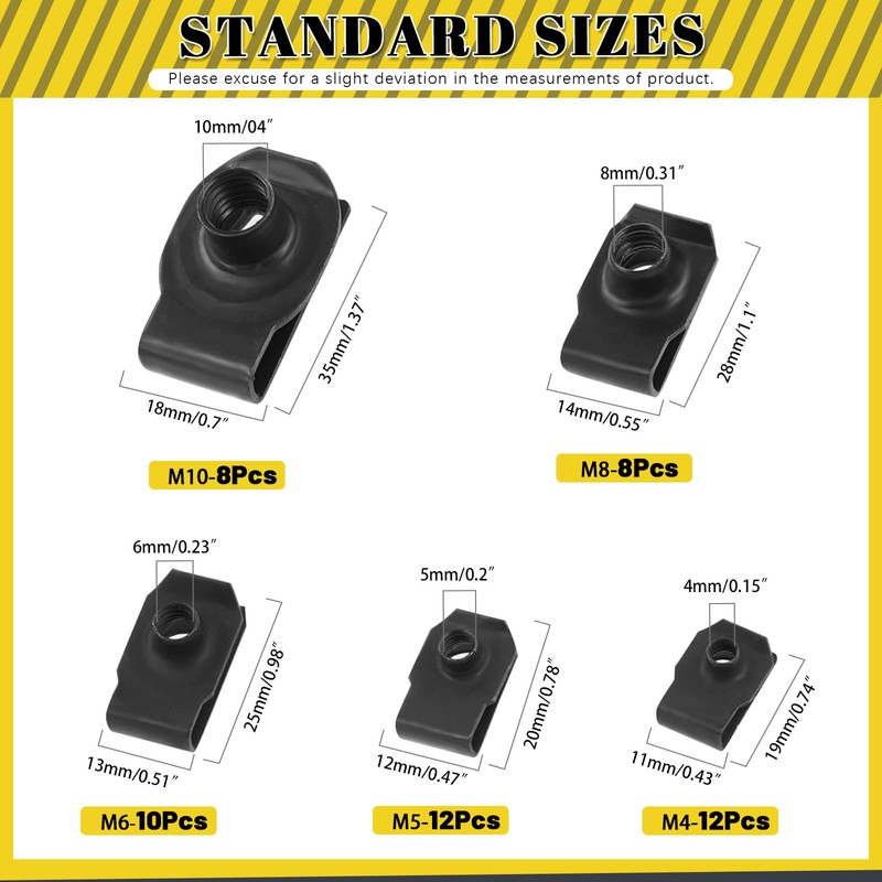 - What You Will Get: You’ll receive 50pcs black carbon steel U nut clip assortment kit, including 12pcs M4 U nut clips, 12pcs M5 U nut clips, 10pcs M6 U nut clips, 8pcs M8 U nut clips, 8pcs M10 U nut clips, variety of sizes and sufficient quantity can meet your various needs. Come with a plastic box for easy storage.