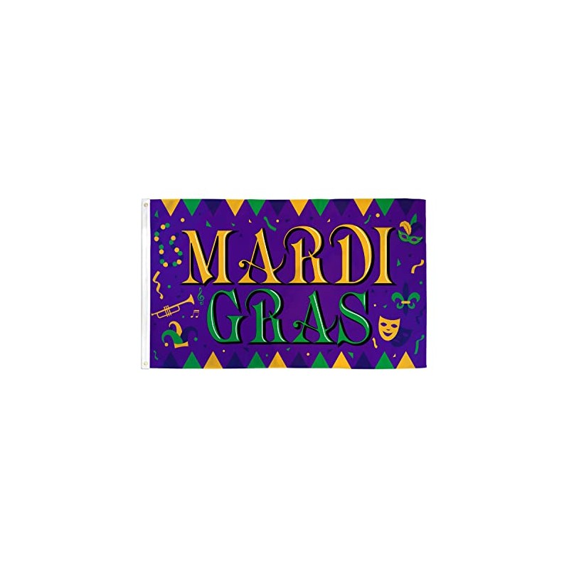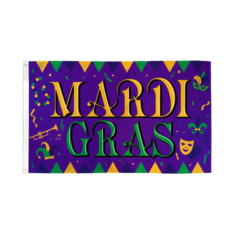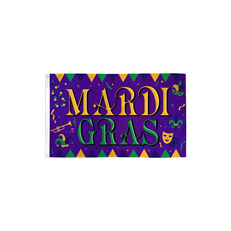 Our 3x5ft Polyester Mardi Gras Festival Flag has header tape and 2 metal grommets Flag is dye-sublimated with beautiful bold colors. Printed on one side all the way through the fabric. Double-stitched around all edges with 4 rows of stitching on fly edge.