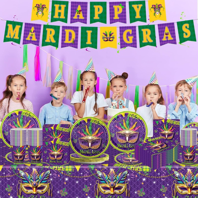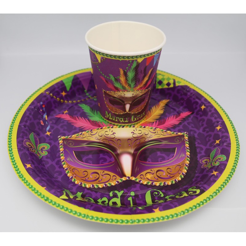 - Design features: exciting carnival party. We have used classic purple, yellow, red and green colors in a variety of carnival patterns and printed the word "Mardi Gras" to create a unique design that catches the eye.