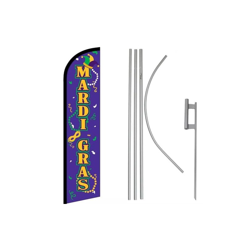 Mardi Gras Purple/Gold Windless Banner Flag & 16' Flagpole Kit/Ground
