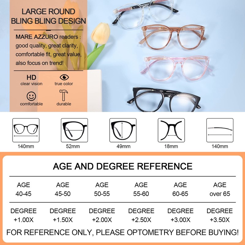 MARE AZZURO reading glasses for women is durable and flattering, more comfy and user-friendly. Superb spring hinges, one-piece nose pads, reducing the pressure on the nose.