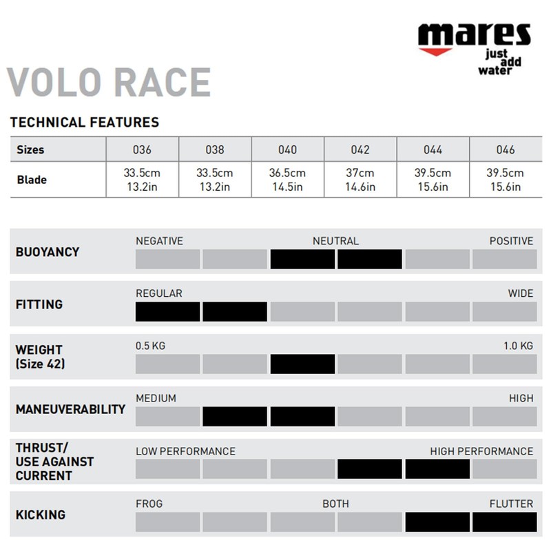 - ANATOMICALLY DESIGNED FOOT POCKET - The Mares Volo Race Fins feature a closed, anatomically designed foot pocket, offering a secure and comfortable fit that enhances stability and power transfer with every kick