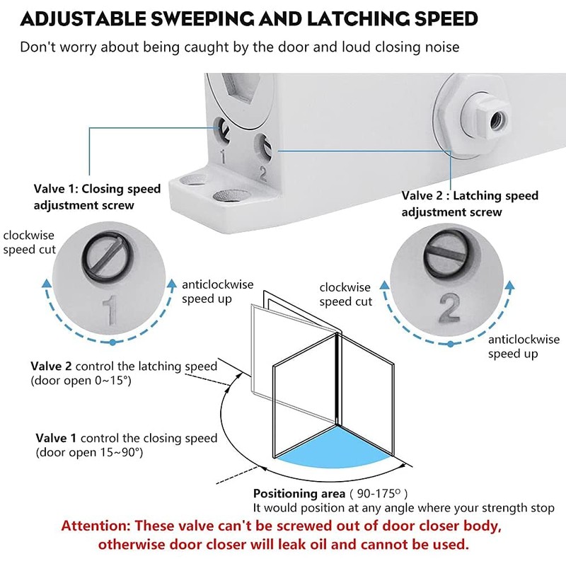 • Adjustable: Two independent valves to control the closing speed and the latching speed, Self regulate the mechanism to meet your needs