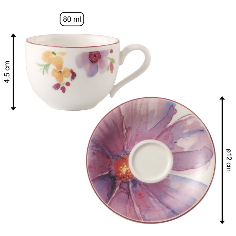 - ELEGANT DESIGN This espresso cup with saucer is decorated with the timeless floral pattern of the Mariefleur Basic collection by Villeroy & Boch that adds an elegant touch to your coffee experience