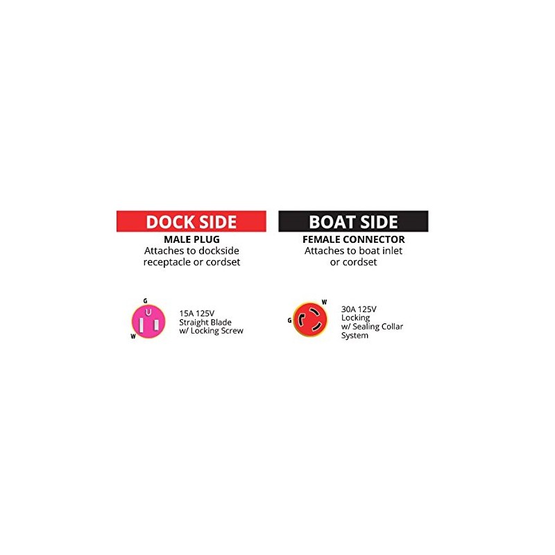 - 15 Amp 125V Straight Blade with Locking Screw Dock Side/Male Plug, 30 Amp 125V Locking with Sealing Collar System Boat Side/Female Connector