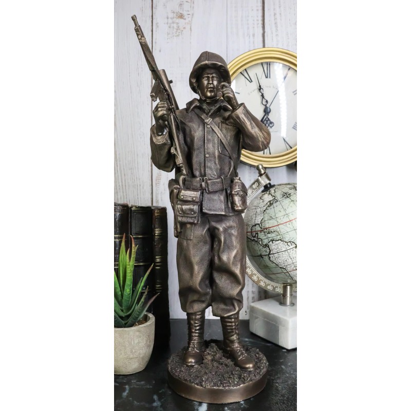 • This World War II Sergeant figurine is made of designer composite polystone resin, hand painted and polished. Polystone which is composed of polyurethane, resin, and mixed with powdered stone additives that give it added weight and a porcelain or "stone-like" feel. Polystone is very durable and delivers a cleaner, more substantial representation of an original sculpture than other common materials.